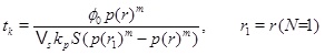 The Damköhler-number N is proportional to the kinetics parameters kpS and inversly proportional to the flow rate Q 0. Fast kinetics and a low production rate assure that N>>1 and that the flow-limited regime applies for all r≥rw. The Damköhler-number is shown in Fig. (4). It increases by two order of magnitude from r=rw to r=10rw, because Damköhler-number is proportional to r2. Notice that parameters kpS are not included in the porosity function (29) for scale formation in this regime. The parameters used in this example are listed in Table 1.