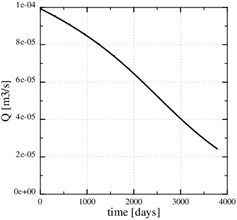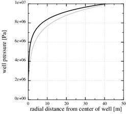 where k 0 is the initial permeability and ϕ 0 is the initial porosity. The exponent n controls how the permeability depends on the porosity, where n=3 corresponds to the Kozeny-Carman model. The exponent n may take different values for different types of rocks [12]. Boundary conditions for the pressure equation (1) is a constant well pressure at the well radius rw and a constant pressure pmax at a distant radius rmax. We assume that the system stays close to a stationary state, which is likely the case for geothermal systems operated with a fixed injection and production pressures, as well as for oil and gas producing wells with a high water-cut maintained by pressure support from water injection at constant pressure. The numerical solution of pressure equation (1) is initialized with a stationary reservoir pressure. The solution for the fluid pressure (1) gives the Darcy flux