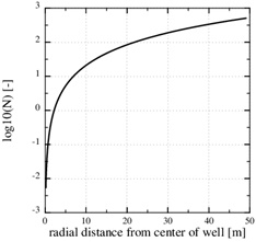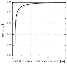 It is only a thin area around the well that becomes clogged by the precipitation process, and it is less than three times the well radius. The porosity relationship (29) can also be written in a dimensionless form using dimensionless time t=t/t 0 and dimensionless radius r=r/rw as