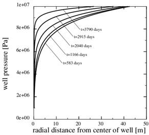 Fig. (12). The fluid pressure at 5 equidistant times between the beginning and the end of the simulation. The pressure gradient increases steeply over the near well area with time. |
