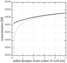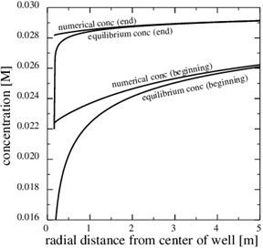 Fig. (13). The equilibrium concentration follows the fluid pressure, and it gets increasingly steep towards the well. |