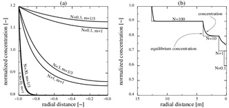The solution for the concentration is split into different intervals, with different constant equilibrium concentrations. The input concentration for an interval, Ĉin, is the solution at the same position as the preceding interval. The first interval has Ĉin=1 and each interval has its own characteristic length and Damköhler-number. The solution is shown in Fig. (2). The solution is shown in Fig. (2). The interval between r(N=100) and r(N=10) is covered by the solution with N=100 and the concentration decreases to the equilibrium concentration at the beginning of the interval. In this regime flow is the rate limiting processe. The same can be said about the next interval with N=10. The interval N=1 becomes the transition between the flow-limited and the reaction-limited processes. Finally, for the interval N=0.1 reaction is clearly the rate limiting.