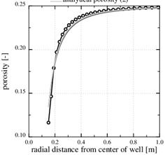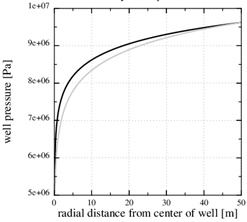 Fig. (5) shows that the chosen permeability (k 0=2.10-16) results at a stationary pressure with a steep gradient towards the well. Fig. (5) also shows the numerical stationary pressure that takes into account the reduced permeability from the reduced porosity shown in Fig. (3). The numerical stationary pressure and the analytical stationary pressure are close, because the porosity is only reduced by half next to the well, which has a moderate impact on the permeability field. A decreasing permeability close to the well implies a decreasing production rate, since the well pressure and the outer boundary pressures are kept constant. In the current example, the initial production rate decreased by 30%, when the initial porosity was reduced by half.