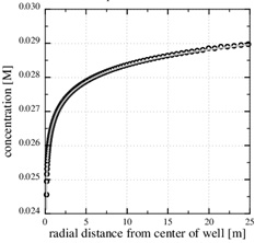 The steep drop in the equilibrium concentration towards the well is a direct result of the steep pressure gradient, as seen in Fig. (8). The stationary numerical pressure is compared with the stationary analytical pressure, when the numerical porosity has dropped to roughly the half, and the difference is moderate.
