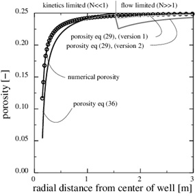 The analytical approximations are very close to the numerical computed porosity, which involves a numerical solution for the fluid pressure and concentration coupled to the changing porosity. Fig. (7) shows the porosity at time t=1660 days, when the numerical porosity is reduced by half. The time scale for the kinetics gives a half-life of tk/2=1055.5, which is less than that calculated from the numerical model. The analytical estimate gives a shorter half-life than the numerical model, because it overestimates the super-saturation close to the well. It should also be mentioned that assuming a flow-limited regime near the well would strongly overestimate the rate of kinetics and strongly underestimate the porosity half-life. The half-life for the case of the flow-limited regime is t 0/2=75 days.