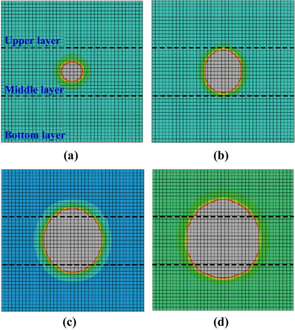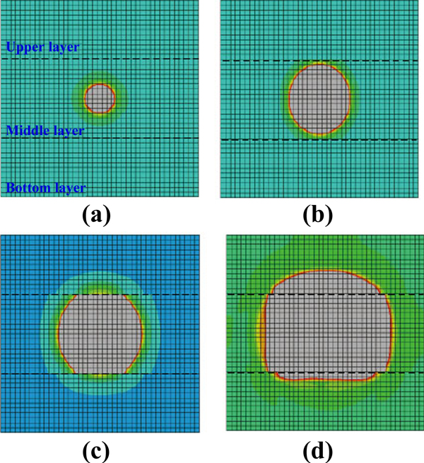 In the numerical simulation study, the first group simulation was conducted to investigate the fracture propagation behavior when the interlaminar geostress difference did not exist. In order to simulate the absence of interlaminar geostress difference condition, three layers in the numerical model (Fig. 3) were given a same Young’s modulus value (upper = middle = bottom = 15 GPa). Fig. (7) shows the result of the numerical simulation with presentation of the change in fracture face. It shows from the Fig. (7a) that when the simulation time was 0.5 ms, the fracture face was relatively small and presented a round shape. With the increase of the simulation time from 0.5ms to 1.2 and 1.6ms, the fracture face was obviously enlarged; however, both of their shapes (Fig. 7b and c) were also round despite that the fracture has already reached and crossed the boundaries of the middle layer. Fig. (7d) illustrates that with the extension of the simulation time to 2.5ms, the fracture further propagated into the upper and bottom layers and the fracture face also showed the round shape. The result of the numerical simulation matched very well with that of the physical simulation.