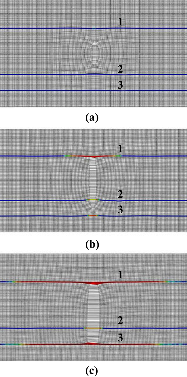 The result of the numerical simulation of the fracture propagation when several special layers with different stiffness exist is shown in Fig. (12). The result was calculated without remeshing procedure that was an advantage of the simulation method. This figure presents the change of fracture vertical cross-section during propagation at different simulation stages. This view orientation is different from the Figs. (7 and 10). At the first stage (Fig. 12a), the hydraulic fracture began to propagate from the wellbore. At the second simulation stage as shown in Fig. (12b), the fracture crossed the layer 2 and stopped at the layer 1, because the distance between layer 1 and wellbore equals that between layer 2 and wellbore. The crossing phenomenon of fracture is mainly due to the relatively weak stiffness of the layer 2. That is to say, a layer with a weak stiffness may not prevent the fracture propagation. In contrast, the fracture stopped at the layer 1 which has a stronger stiffness. Similar result was obtained at the third simulation stage when the hydraulic fracture reached the layer 3 which also has a relative high stiffness (Fig. 12c). After passing through layer 2, the hydraulic fracture kept growing along the direction toward layer 3 and finally stopped at there. Therefore, the fracture height was limited due to the barrier effect of layers 1 and 3. It can be also found that the hydraulic fracture became wider with the continuance of the simulation. It can be concluded from the above results that the fracture passed through the weak and stopped at the strong. It is due to the reason that the hydraulic fracture propagate when the pressure in the fracture is higher than the rock failure stiffness [20], and that the pressure is high enough to make the fracture cross the weak layer but not enough to cross the strong layer.