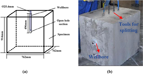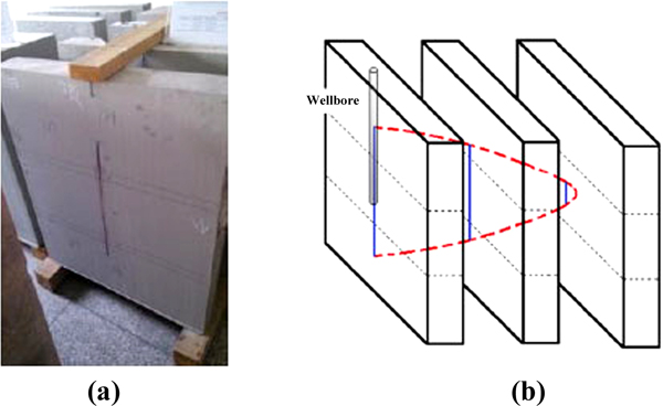 The rock samples were collected from Changqing oilfield of China, and they have been processed into 762 mm×762 mm×914 mm cubes before experiments. The size of the rock sample is large enough to guarantee that sufficient amount of data can be collected during experiments of actual fracture extension [12]. An artificial wellbore with an open hole located at the bottom was drilled in the rock sample, as shown in the Fig. (2a). The fracturing fluid used in experiments was guar gum fracturing fluid which was colored into red so that the fracture morphology can be presented clearly. It was injected into the open hole with an injection rate of 60mL/min to simulate the actual fracturing process. After the physical simulation experiment, to directly observe the hydraulic fracture, the rock sample was split or cut into pieces to reveal the fracture morphology, as shown in the Fig. (2b).