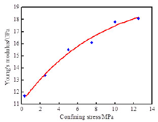 The relationship between Young’s modulus and confining stress was obtained from the compressive stiffness test of rock sample, and data are shown in Fig. (4). It can be seen that the Young’s modulus increases with the increase of the confining stress. According to this kind of monotone increasing trend, the Young’s modulus can be used in the numerical simulation to replace the confining stress, and meanwhile a similar effect can be achieved.
