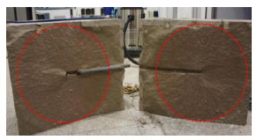 After the completion of the hydraulic fracturing experiment, 1# rock sample was taken out of the stress loading system and was split along the propagation direction of the hydraulic fracture so that the fracture face could be revealed. Because the fracturing fluid was colored into red before, the red area on the rock split face was the fracture face area (propagation area), just as shown in the Fig. (5). It can be found that the fracture face was round when the interlaminar geostress difference did not exist, and a symmetrical double-wing fracture whose propagation direction was perpendicular to the minimum horizontal stress σh was generated.