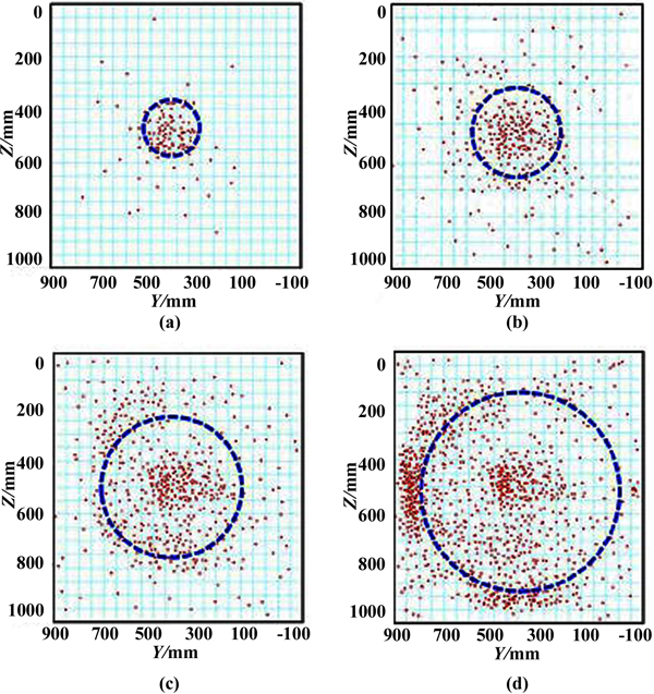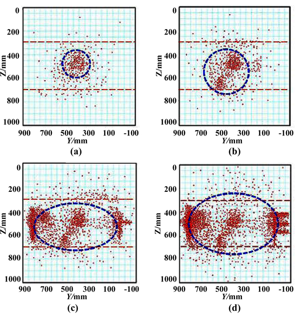 Fig. (6). Acoustic emission points distribution at different stages. (a) 400s; (b) 960s; (c) 2200s; (d)3240s. |