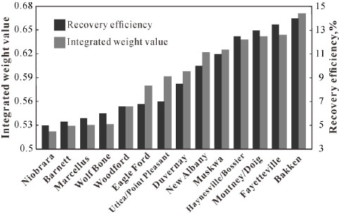 According to the Grey Relational Grade model, we select the matrix permeability as the primary index and then the weight of every parameter is obtained as: W = (0.0583, 0.0610, 0.0567, 0.0662, 0.1029, 0.0564, 0.0522, 0.0661, 0.0551, 0.0613, 0.0526, 0.0558, 0.0678, 0.0646, 0.0686, 0.0543, 0.0488)T. The correlative grade of every shale gas reservoir is shown in Table 4. Calculate the synthetically weighted value to achieve F=(fij)n, and then F=(0.6712, 0.5293, 0.5978, 0.5798, 0.6217, 0.5222, 0.5914, 0.5312, 0.5536, 0.6437, 0.6379, 0.5302, 0.6421, 0.6251). We can see that the ranking exploitation potential of each target shale gas reservoir from large to small is Bakken, Fayetteville, Montney/Doig, Haynesville/Bossier, Muskwa, New Albany, Duvernay, Utica/Point Pleasant, Eagle Ford, Woodford, Wolf Bone, Marcellus, Barnett, and Niobrara. This is in accordance with their recovery efficiency 14.0%, 13.5%, 13.0%, 12.5%, 11.0%, 10.0%, 8.5%, 7.0%, 6.8%, 6.6%, 6.0%, 5.6%, 5.3%, and 5.0%, respectively. The calculating results is in accordance with the field result, as shown in Fig. (2), which indicates that the established grey relational grade model is accurate and reliable. Therefore, it can be applied for the evaluation of the exploitation potential of shale gas reservoirs, and the evaluation of the impacting degree of main factors for optimizing the production of shale gas reservoirs.