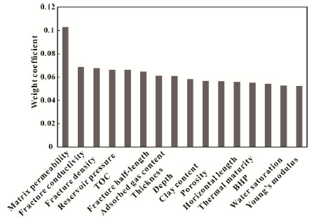 According to the calculated weight of every parameter, the impact ranking of main factors from more important to less important is the matrix permeability, fracture conductivity, fracture density of hydraulic fracturing, reservoir pressure, TOC, fracture half length, adsorbed gas, reservoir thickness, reservoir depth, clay content, porosity, horizontal length, thermal maturity, BHP, water saturation, and Young’s modulus, as shown in Fig. (3).