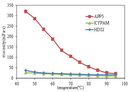Methods: formulate solutions of the three kinds of polymers, whose concentration is 2500 mg/L; measure the changes of viscosity of three kinds of polymer solutions while the temperature rises. The measuring results are shown in Fig. (2).