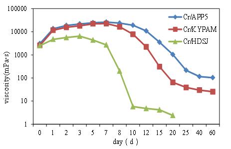 Polymer decomposition leads viscosity of the three kinds of polymer solution to decrease rapidly and viscosity retention rate are generally low.