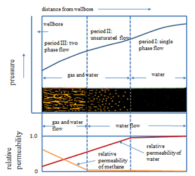 The gas producing rate depends on the slowest one among the 4 key processes. Because most methane is adsorbed on coal surfaces, and formation water exists in natural cleats, so, the methane is difficult to desorb freely, which results in the speed of desorption and diffusion of methane in coal matrix is the lowest. At this condition, the process of desorption and diffusion will determine the CBM production rate.