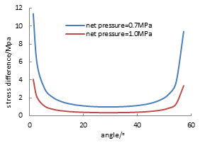 When friction factor is 0.6, and fracture net pressure is 0.7 MPa, the critical stress difference can be calculated under different angles. If treatment net pressure surpasses this value, the natural fracture will shear and slide. The angle between natural and hydraulic fracture impacts the critical net pressure greatly (Fig. 6). When the angle is larger than 60o, the critical net pressure will increase quickly. Under this condition, although the treating pressure raises much, it is difficult to shear the natural fracture. The direction of natural fractures is important for shearing, and it requires that the angle between natural and hydraulic fracture should be clarified before designing a proper treatment schedule.