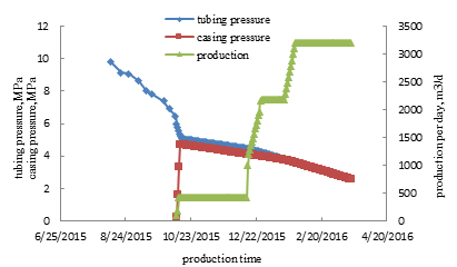 The above new fracturing methodology was applied in Qinshui CBM basin. The key of stimulation treatment is to control pumping pressure lower than fracture pressure at the beginning. When natural fractures are connected to form network fractures to a certain scale, then pumping pressure is increased to generate main fracture channel. At some distance around wellbore, network fractures are generated, hence, dewatering and desorbing rate will be raised, and higher methane production will be acquired eventually. The new fracturing methodology was tested on SZ 37-8 methane well, and half a year later, the CBM production was nearly 2000 m3/d. Ultimately, the production kept at 3200 m3/d, which exceeded the average production by a factor of 3.2 (Fig. 7).