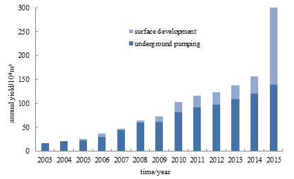 In China, as an effective increasing permeability technology for coal seam underground, drilling hydraulic fracturing has been widespread applied with good results, which can be confirmed by the production yield statistics (Fig. 8). The total production yield of CBM is 152 × 108m3 in 2014, and 36 × 108m3 is from the surface development, 116 × 10 8m3 from underground pumping of coal mines. Although underground fracturing is confined to the space and equipment ability,it is difficult to achieve large displacement or add proppant and crack is easy to closing, the mechanism of increasing coal permeability should be focused on. It shows that natural cracks could open, extend and connect to form fracture network during this underground treatment, and it also provides clues and new vision to improve conventional fracturing used in CBM reservoirs. On the other hand, it means that the technique to shear the natural fractures before opening them can be realized and feasible.