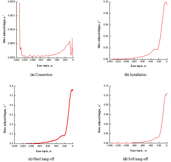 Fig. (4) shows that in connection mode, wave induced fatigue damage of upper and lower riser is large under the combined influence of wave load and platform motion. The upper riser fatigue damage is primarily affected by the wave load, while the lower riser fatigue damage is mainly affected by the drilling platform motion, especially the drift motion of platform. The single amplitude of platform drift motion can cause a great stress variation of riser near bottom. So the fatigue damage near the bottom end of riser is large. In installation and hang-off mode, the riser system vibrates axially under the influence of the heave motion of platform. The inertia force generated by riser axial vibration can increase axial load of upper riser greatly, and the upper riser experiences great fatigue stress. So the wave induced fatigue damage of the upper riser is larger than that of the lower riser. Compared with riser fatigue damage in hard hang-off mode, the riser fatigue damage in installation and soft hang-off mode is smaller. In installation mode, the riser installation condition is mitigatory and the riser axial vibration is light. The relevant fatigue stress and damage are small. In soft hang-off mode, the riser is hanged on the platform via tensioner system which can relieve axial vibration of riser effectively. So the riser fatigue damage is smaller than that in hard hang-off mode.