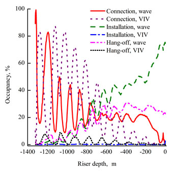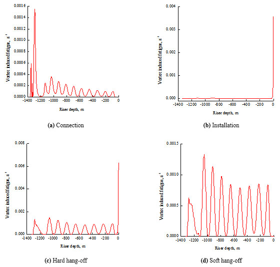 In connection mode, the operation condition of riser is normal sea state and the long-term current profile is simulated based on the Weibull distribution model. In installation mode, sea state in one year return period is chosen for analysis and the relevant surface current velocity is 1.07m/s. In hang-off mode, sea state in ten years return period is chosen for analysis and the relevant surface current velocity is 1.43 m/s. Based on the above parameters, vortex induced fatigue of riser in different operation modes is analyzed respectively, as shown in Fig. (5).