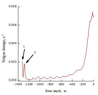 Figs. (6 and 7) show that the combined fatigue damage of upper and lower riser is large. Two fatigue damage peaks appear at the lower riser due to the combined effect of wave induced fatigue and vortex induced fatigue. Peak 1 is primarily affected by the wave induced fatigue damage in connection mode, and peak 2 is mainly affected by vortex induced fatigue damage in connection mode. The maximum fatigue damage appears at the upper riser system and is mainly affected by wave induced fatigue, especially that in installation and hang-off modes. Although riser installation and hang-off time is short, the fatigue damage during this time has a great influence on the combined fatigue of riser and cannot be neglected.