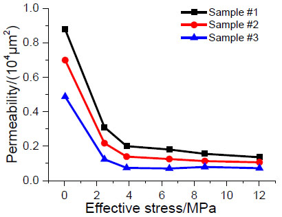 As can be observed from the figure above, with the increase of effective stress, the permeability of coal is getting smaller, when the effective stress is increased to a certain degree, the permeability of the coal rock will remain constant and become stable.