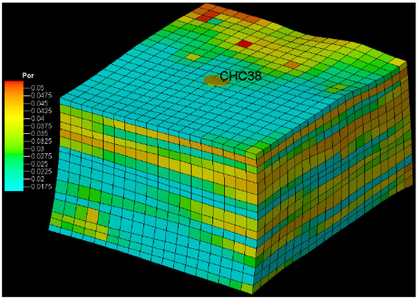 The well CHC38 was set as the center of simulation zone, the scope about one well distance 100 m away from the well as its controlling area, the model specifications are as follows, number of grids at x, y and z are 17, 19 and 16, the mesh size is 5 m, 5 m, 3 m, the top depth of the coal seam is 400 m, and water saturation ratio is 0.68, initial porosity and permeability parameters of the numerical model is obtained by 3D DSI interpolation, according to well logging data, 3D geological and mesh model are shown in the Fig. (4).