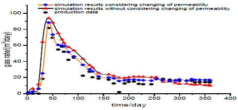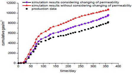 The gas rate and cumulative gas are given in Figs. (5 and 6), respectively. The process of CBM production with and without considering changing of permeability are both simulated, and the simulation results are compared with the production data.