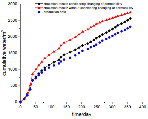 From Fig. (6), the cumulative gas for the simulation considering the variation of permeability is less than that without considering, which can be explained by the deformation of coal rock. According to the equation (5), (8) and the results of the experiments, it is obvious that the permeability of the coal rock will gradually decrease as the increase of the effective stress in the coal seam, which is resulted from the decrease of the pore pressure.