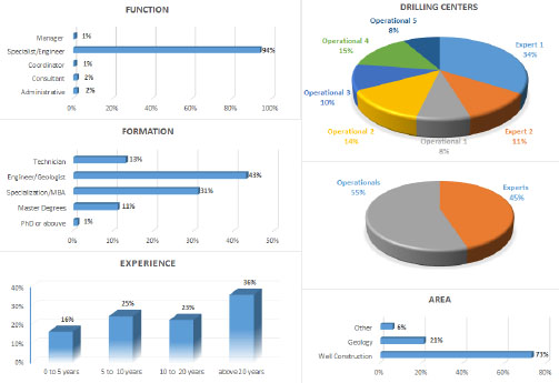 In Section Two, it was explained that during drilling, completion, or workover operations the Petrobras Drilling Centers provide technical support for operational decision making at rigs. These support are from multidisciplinary teams working 24/7, using different technologies, equipment and process. In this way, to better understand the maturity of these environments, geographically located in different regions, the survey was sent to all workers in the Petrobras drilling centers. Fig. (3) shows that almost all of them are specialists and engineers (94%), with postgraduate degrees and seniority (only 16% were early in their career). The population was well divided between the two expert and five operational drilling centers. The majority of the respondents (73%) are dedicated to well construction. Statistical analysis was applied to the results to support the application of this methodology to other oil industry scenarios and to understand the scalability of this study to other companies.