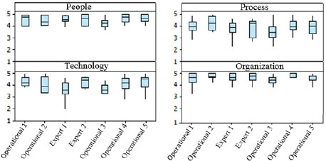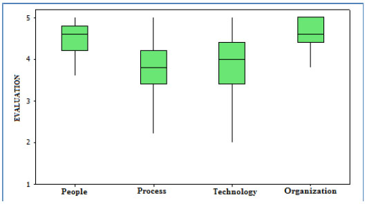 Considering the average and median of the evaluations, it is concluded that the respondents’ perception is that the people and organization clusters perform better than the other two, process and technology. The general distribution of the evaluations for the clusters is well depicted by the box plot in Fig. (4).