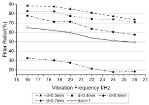 As the vibration frequency increases, the move activity of particles improves. It will decrease the contact time when the particles hit the screen, and then reduce the possibility that the particles pass through the sieving pole. As Fig. (10) shown, the filter ratio decreases as the improvement of vibration frequencies f obviously. For the easy through particles, which satisfy d/a<1, keep a high filter ratio over 70%.