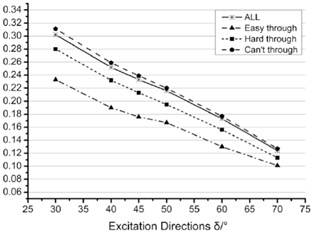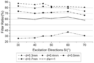 The excitation directions δ studied in this part keep in same with Part 4.2 while keeping the other parameters unchanged. The calculation results and variation tendency of δ are shown in (Fig. 11). As the increase of excitation direction, the conveyance velocity improves, but the activity of particles doesn't enhance. In hence, the excitation directions δ increase, the filter ratio only has a small fluctuation, but overall the whole filter ratio of all particles does not change too much.