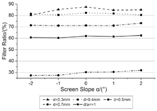 The screen slopes studied in this part keep in same with Part 4.3 while keeping the other parameters unchanged. The calculation results are shown in (Fig. 12). On the one hand, the screen slopes up gradually as screen slope α varies from -2° to 2°. Particles will accumulate around the inlet, and the filter ratio will increase. On the other hand, the angle change is very small, so the variation of filter ration is very slight.
