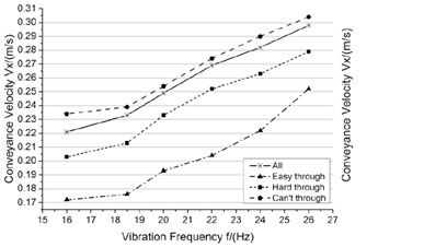 - The conveyance velocity vx of solid particles is approximately linearly related to vibration frequency f, excitation directions and screen slope. The smaller vibration frequency f, the less vx will be. The particle size has great influence on conveyance velocity, but the sensitivity of different size particles to vibration frequency and screen slope is approximately consistent with each other, while excitation directions have greater influence on big particles. As the increase of the excitation direction, conveyance velocity of big particles decreases more quickly.