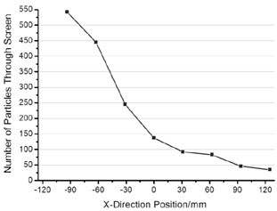 In order to study the varying pattern of filter ration along screen, the screen plane is divided into 8 sections. As Fig. (9) shown is the number of particles along the screen that can pass through the sieve pore during the whole simulation process. It can be easily deduced that the filter ratio of particles decreases along the screen from inlet to outlet. The accumulation of particles around the inlet will increase the filter ratio. So in order to reduce the stacking condition and decrease filter ratio, it would be better that particles there can be conveyed forwardly by throwing motion as soon as possible.